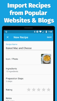 • Import Recipes from the Web: Save recipes directly from thousands of recipe blogs and websites.