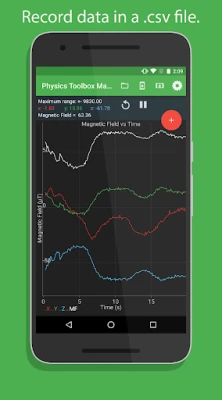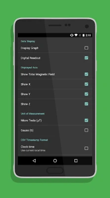 Total magnitude magnetic field strength can be recorded and exported in an e-mail or through Google Drive as a .csv attachment using a comma or a semicolon as a delimiter. Click on settings to plot data against elapsed time or clock time, to change the plot line thickness, or to change data collection rate. A brief tutorial upon start-up gives an overview of how to use the app.