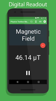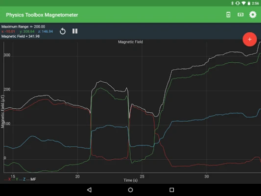 This magnetic field sensor app measures and displays a graph of Magnetic Field (µT) vs. Time (s) that in x, y, and/or z dimensions, as well as total magnitude. By accessing settings, data can also be displayed with a digital read-out.