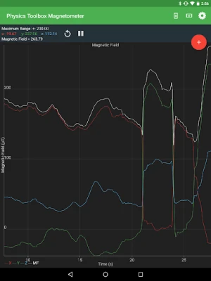 This magnetic field sensor app measures and displays a graph of Magnetic Field (µT) vs. Time (s) that in x, y, and/or z dimensions, as well as total magnitude. By accessing settings, data can also be displayed with a digital read-out.